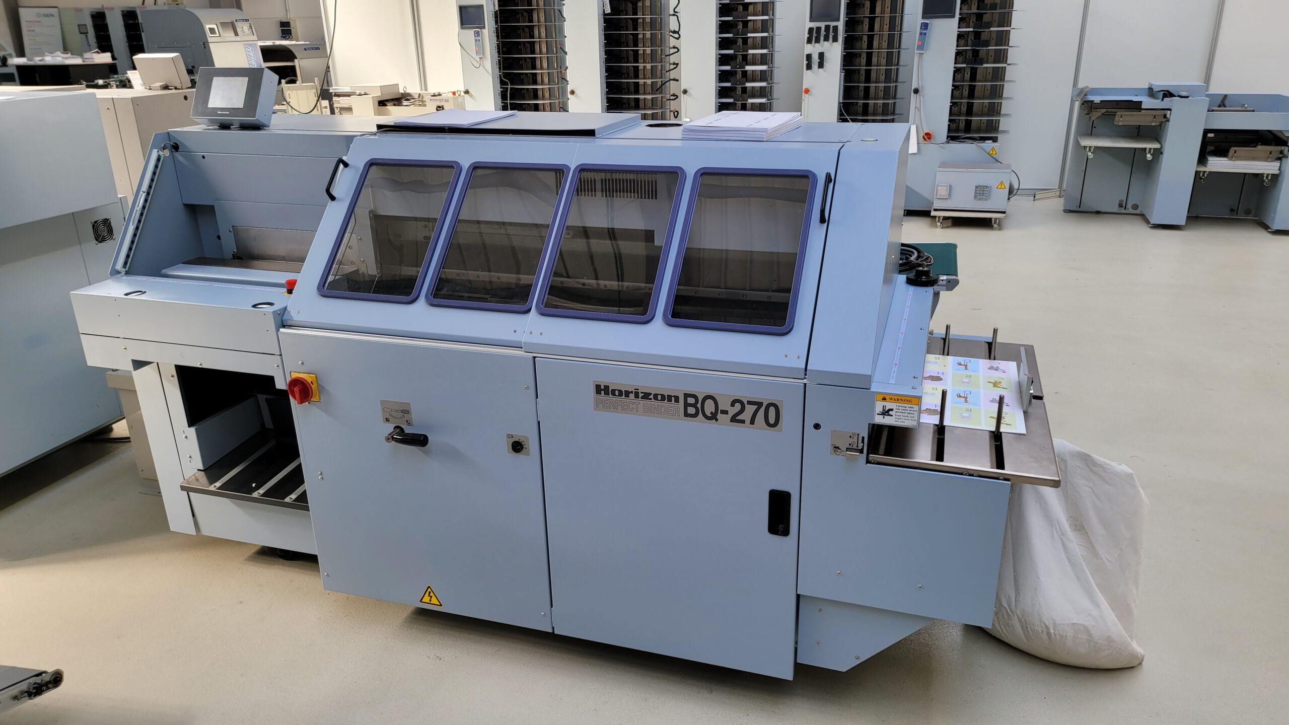 Refurbished single-clamp binder BQ-270 with EVA gluing. The fully automatic BQ-270 binding machine is ideal for medium to short-run production – down to single copies. The BQ-270 is equipped with an intuitive touch screen, from which virtually all settings can be controlled.