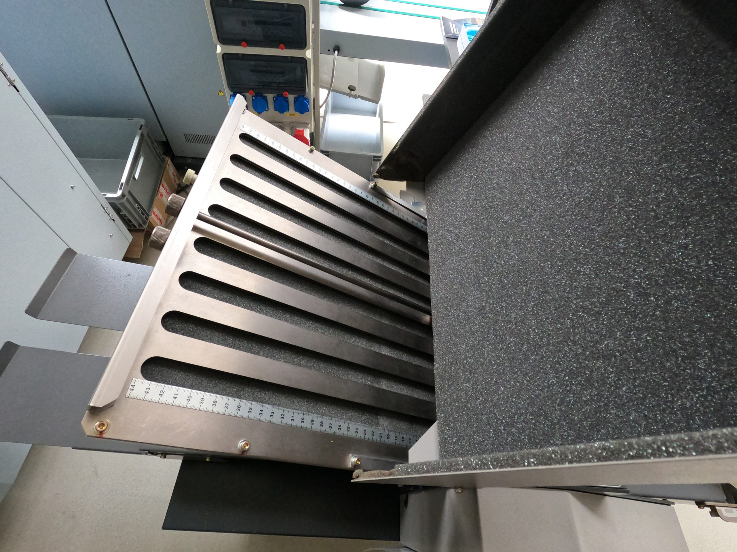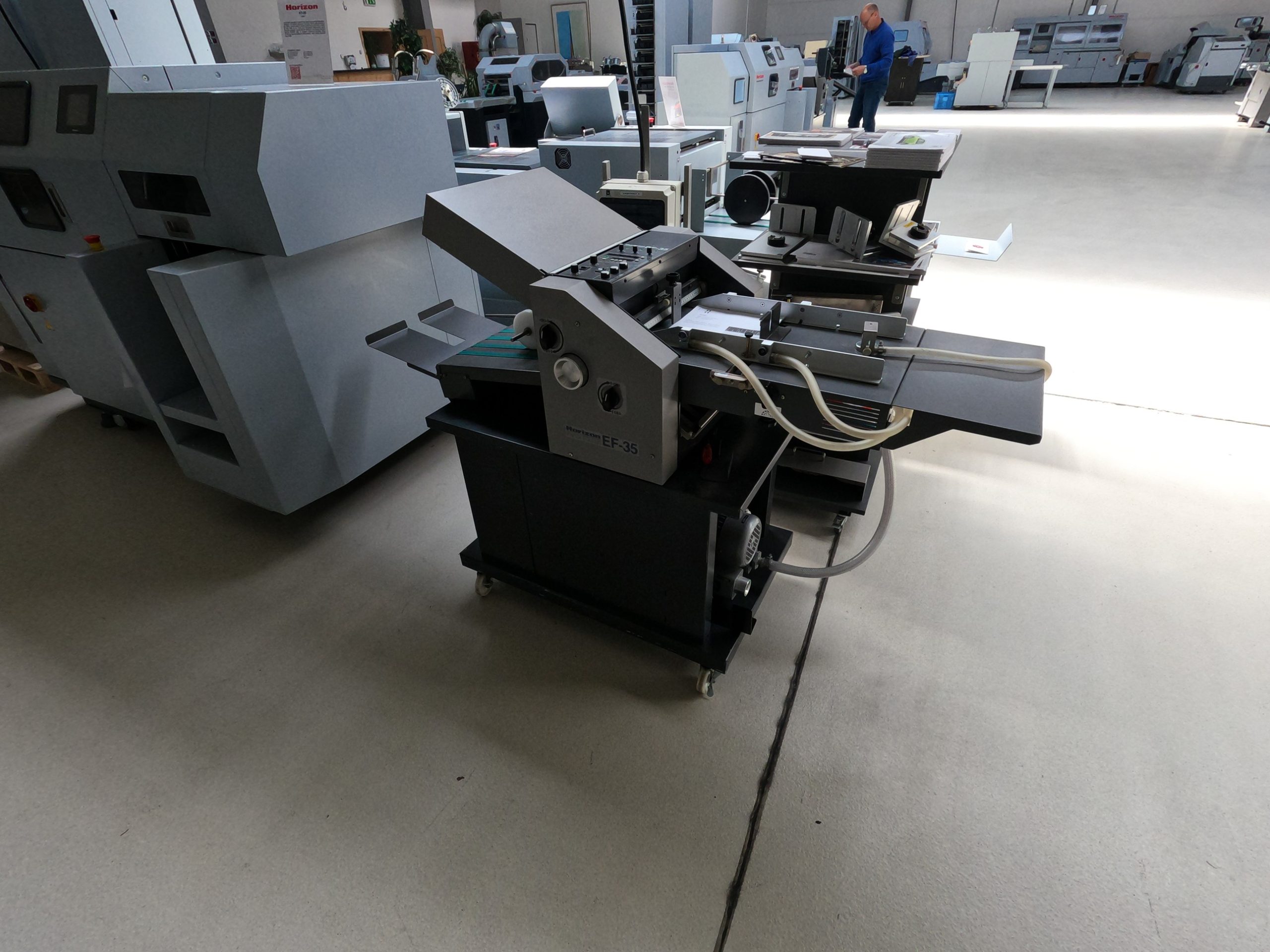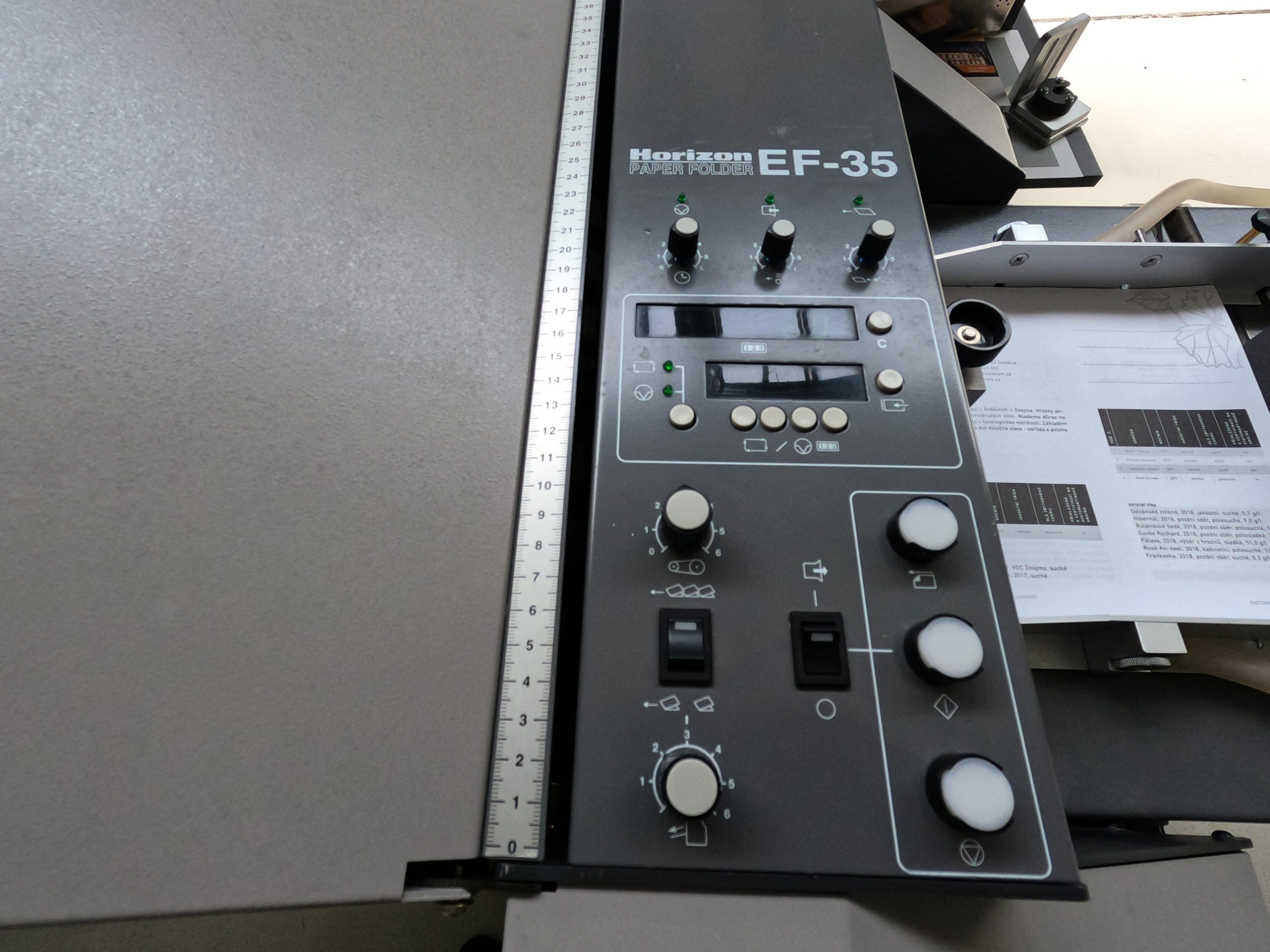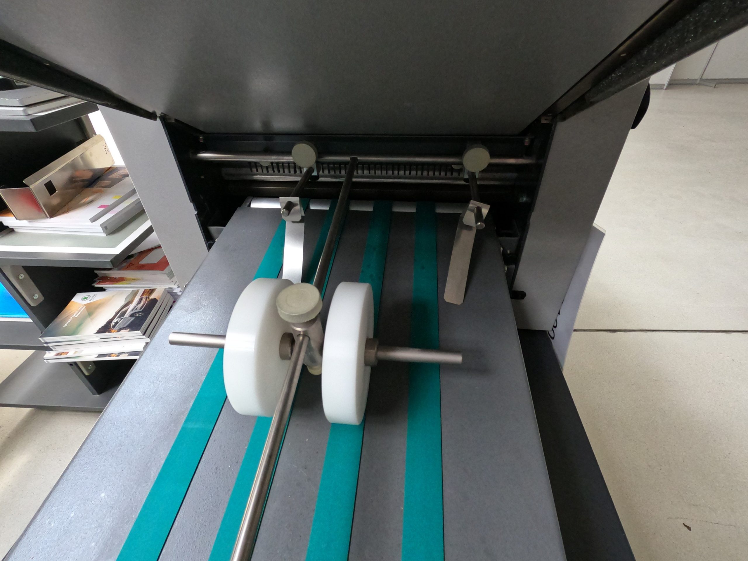The EF-35 folding machine is a robust machine with 2 buckles. Its compact design features a bottom-loading system and top-up replenishment, a combination of self-compensating folding rollers, and a space-saving variable-speed delivery stacker. A chassis with wheels is included as standard equipment. This machine is ideal for direct mailing, folding brochures, and similar applications.